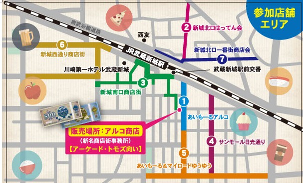 以下に参加店をお知らせしますが、商店街名は通称名ですのでマップから探して下さい。