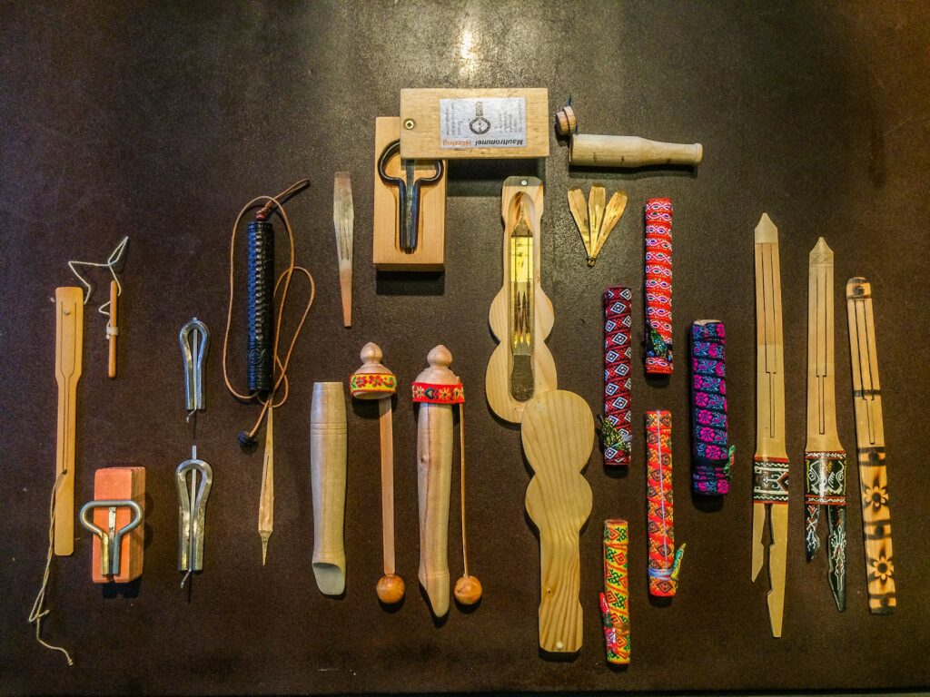 金属や竹、木などで作られた楽器で、弾力のある弁を指で弾いたり紐を引いたりして振動させ、奏者の口の中を共鳴させて音を出す楽器です。口の中の空間や息の吹き方を調整することで音色や音程を変化させることができ、とっても楽しいんですよ!