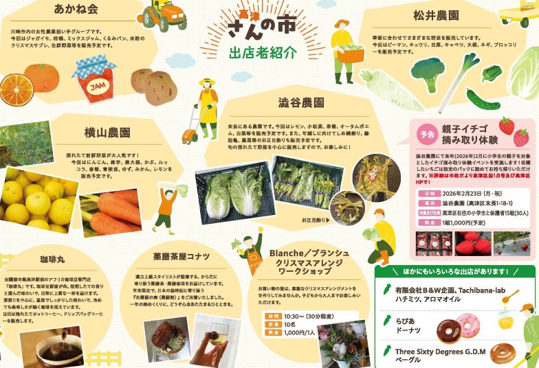 来年(2026年)2月に高津区在住の小学生の親子を対象としたイチゴ摘み取り体験イベントを実施します。詳細は市政だより高津区版1月号及び高津区HPで確認して下さい。