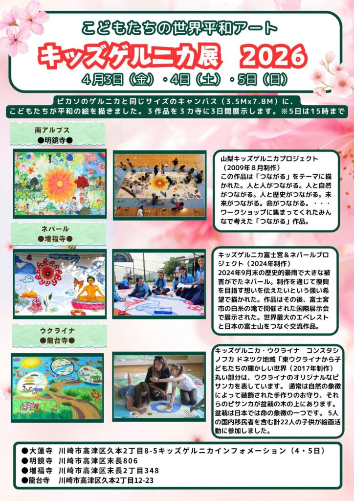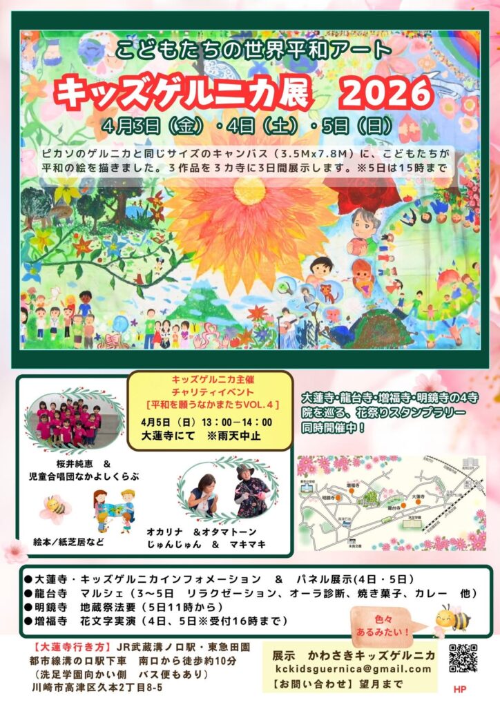今年も、高津区のお寺4か寺で行われる花祭りスタンプラリー期間中に、お寺のご協力を賜り、敷地内に3点のキッズゲルニカを展示します。