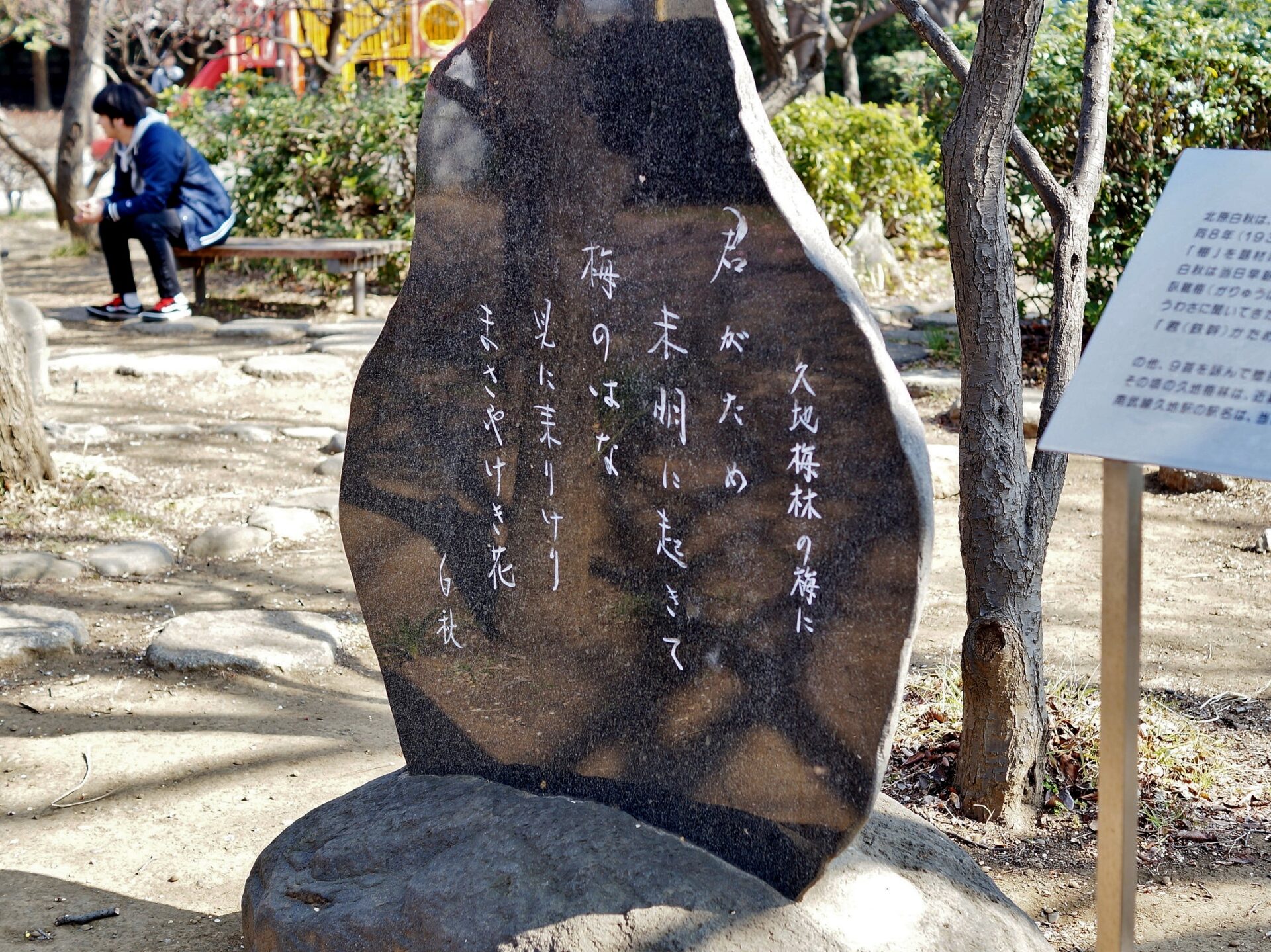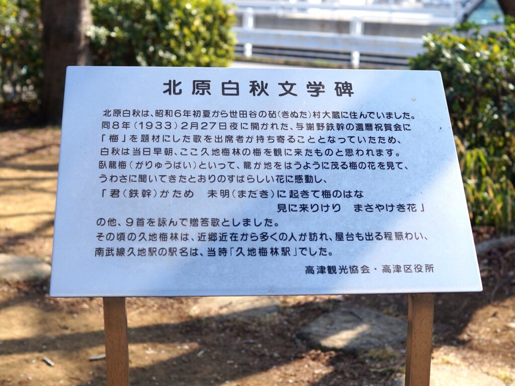 同8年(1933)2月27日夜に開かれた、与謝野鉄幹の還暦祝賀会に「梅」を題材にした歌を出席者が持ち寄ることとなっていたため、 白秋は当日早朝、ここ久地梅林の梅を観に来たものと思われます。