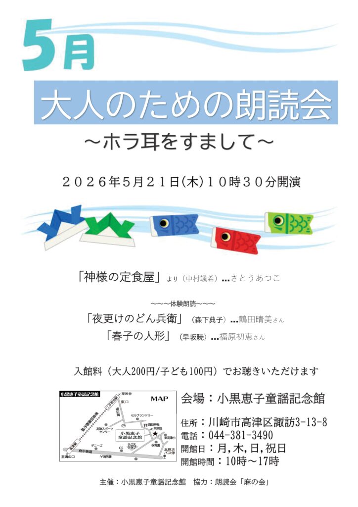現在、体験朗読(読み手)募集もおこなってます。 詳細は小黒恵子童謡記念館HPをご覧ください。 残り僅かです。