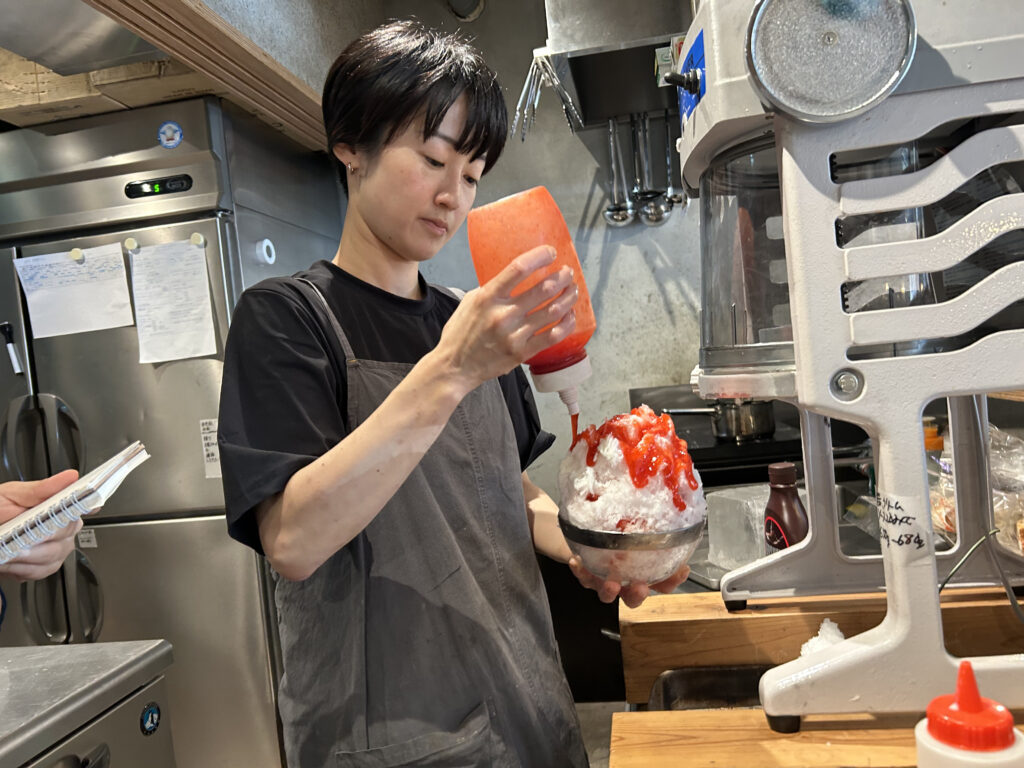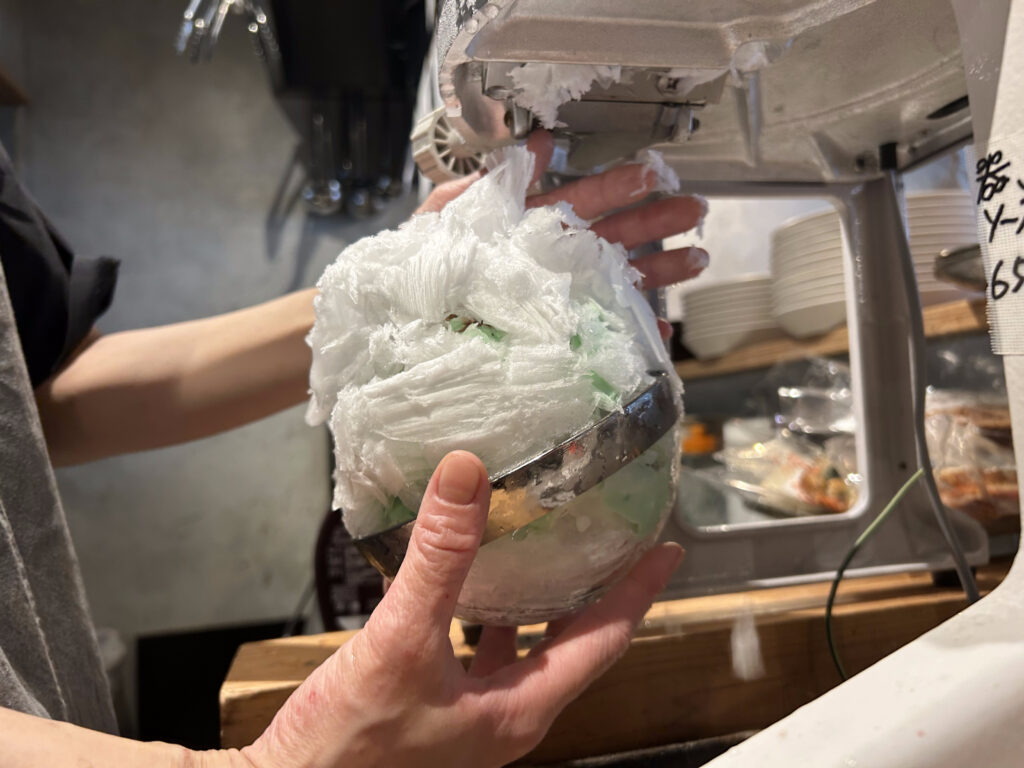 練乳とミントクリーム、チョコソースをかけては、上から氷を重ねる…。この工程を3度繰り返して仕上げる。