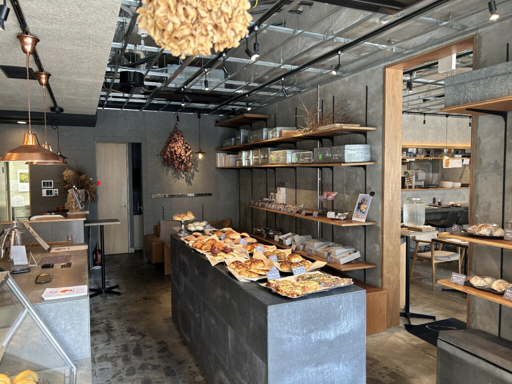 『Len溝の口本店』。手前には見た目も美しいパンが、棚には焼き菓子が並ぶ。写真右奥がカフェゾーン。