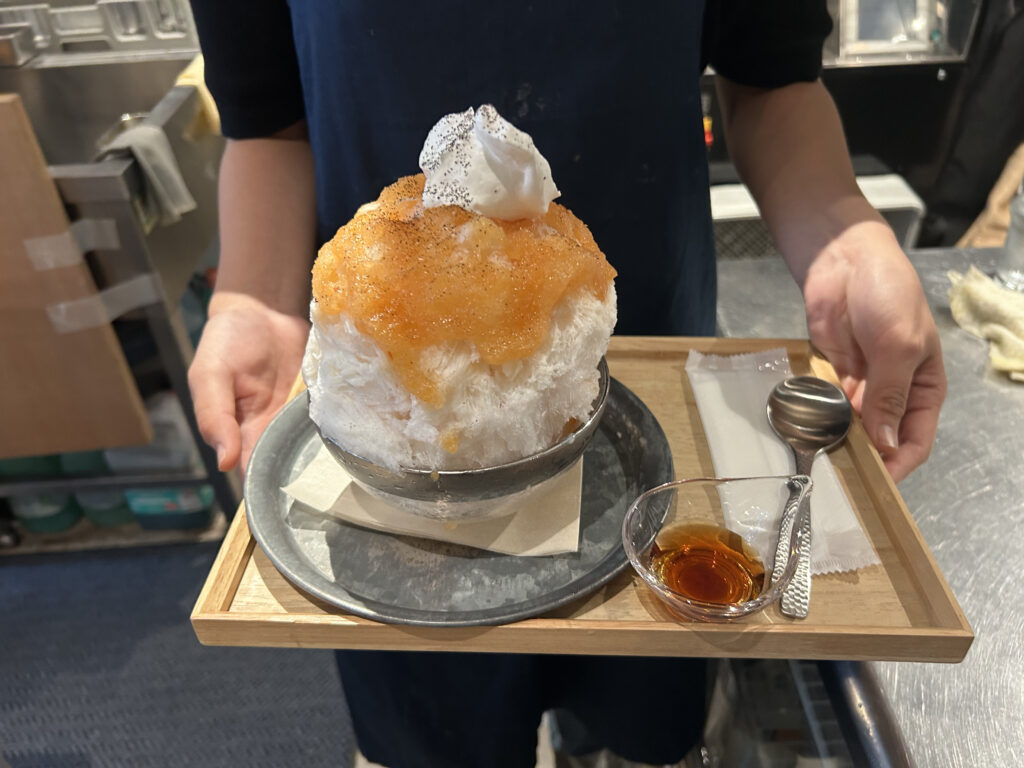「白桃とアールグレイのかき氷」1,540円。マスカルポーネクリームと、アールグレイ・パウダーの相性が抜群なのだとか。