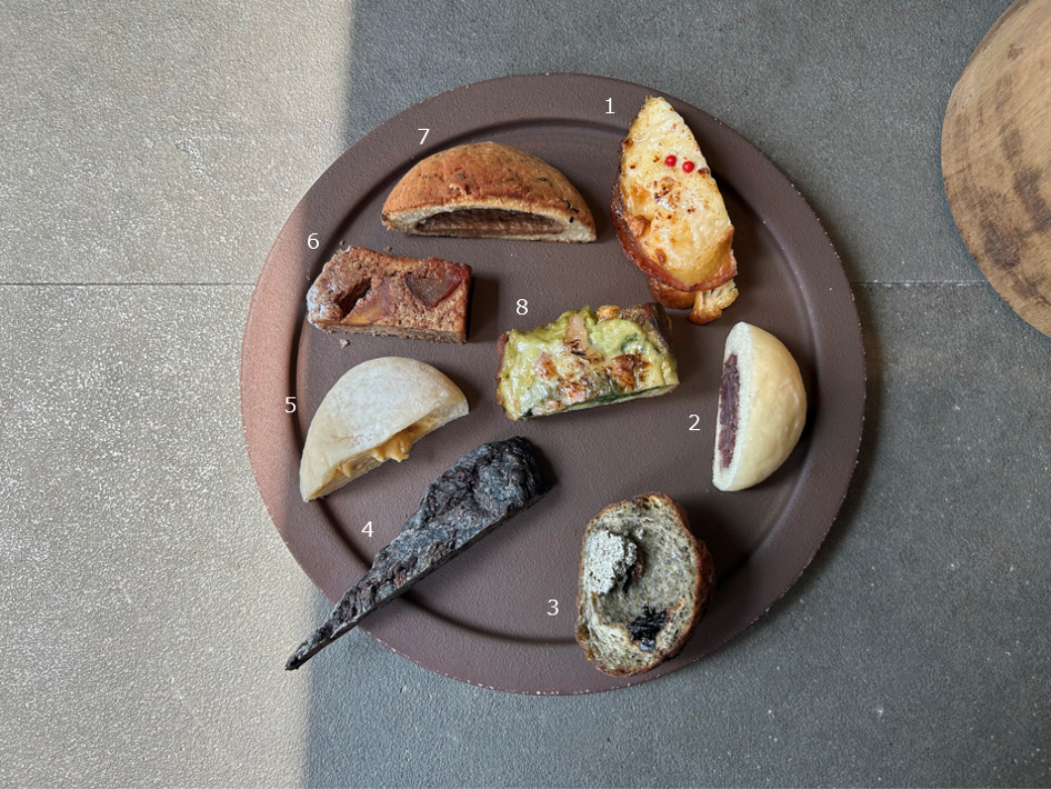 「Lenパンアソート」990円。1.クロックムッシュ 2.みよしのあんぱん 3.海苔まる 4.キコリの竹炭ショコラ5.もっちりほっぺのクリームパン 6.アップルシナモンケーキ 7.チャイメロンパン 8.ほうれん草とベーコンのタルティーヌ