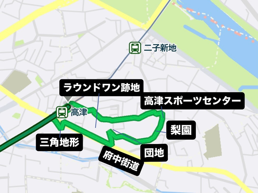 マップを見るとどうやら「ラウンドワン高津店」跡地の真裏を歩いている。ニトリが完成してからの高津駅周辺はどうなるのか、楽しみだ。道なりに何度か曲がっていくと、ようやく駅が見えてきた。