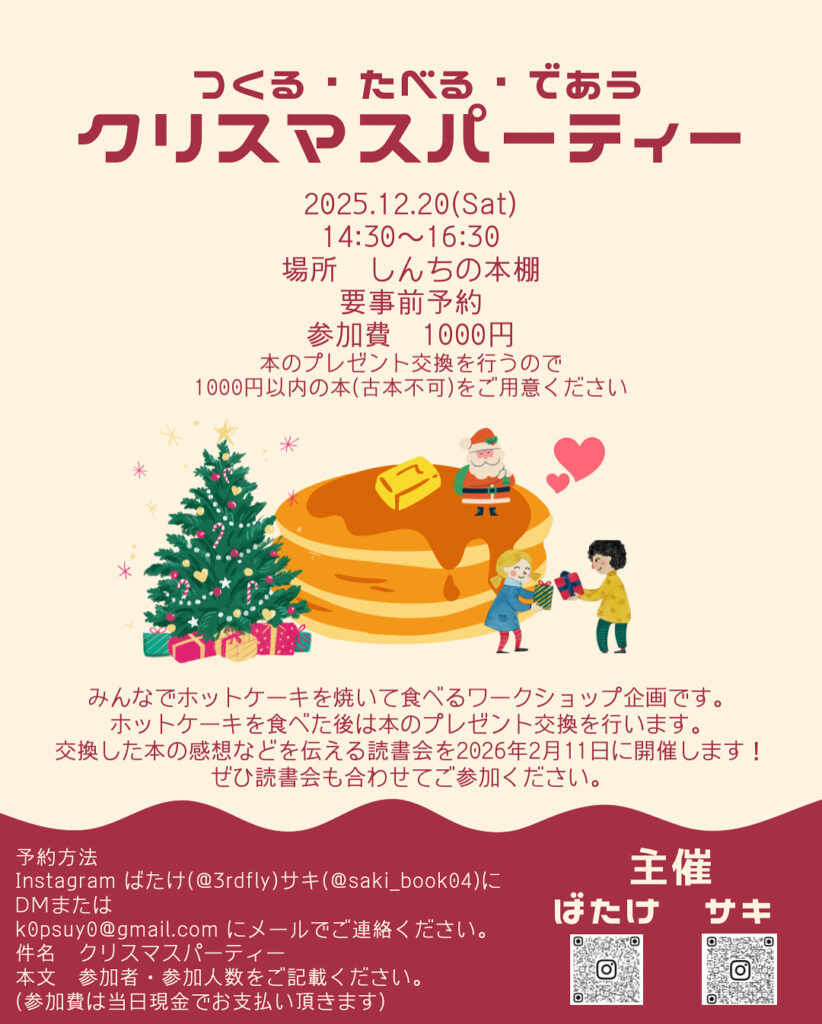 ~🥞つくる・たべる・であう📚クリスマスパーティー🎅~ 今回、しんちの本棚で出会った棚主2人(サキ&ばたけ)によるクリスマスSPのワークショップを開催します。みんな…
