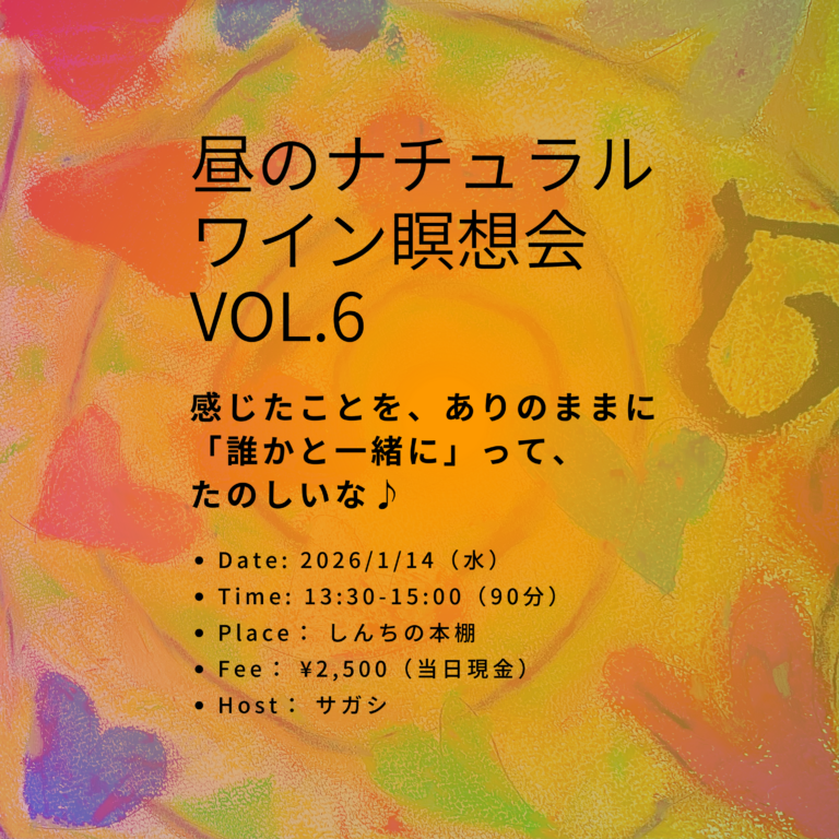 🌿 昼のナチュラルワイン瞑想会 VOL.6 感じたことを、 言葉や絵にしてみる。 誰かに話すことで、 自分の感性が また少し、ひらいていく。 正解も、上手さも、ありません。 今の自分を、そのまま味わう時間です。 📅 1月 […] -