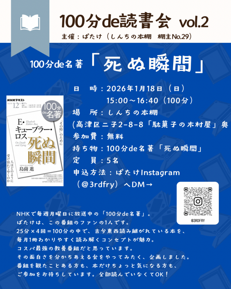 しんちの本棚で棚主をやっているばたけと言います。NHKで放送中の「100分de名著」で取り上げられている本をテーマに、1〜2ヶ月に1回、100分de読書会を開催しています。 今回はキューブラー・ロスの「死ぬ瞬間」です。死 […] -